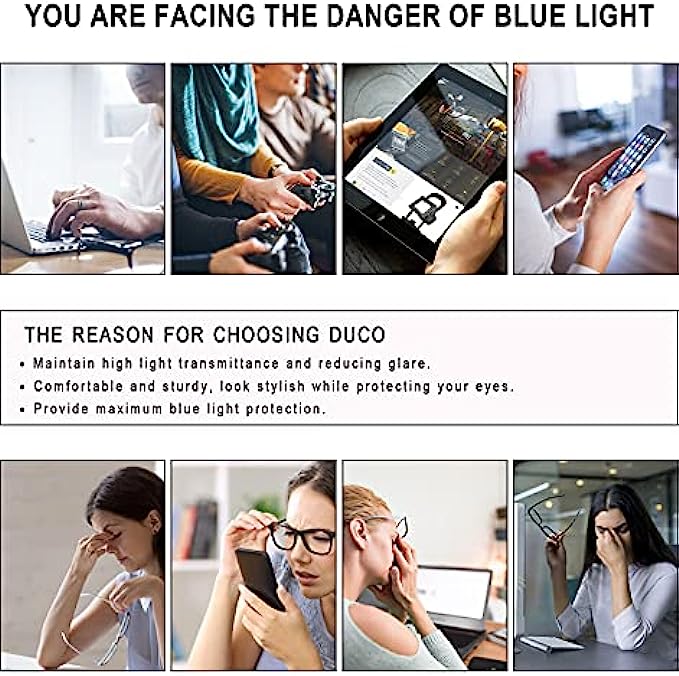 • ?【Provide long-term protection】Anti-blue light glasses can help you feel relaxed after a long day of work. When you wear this blue light filter, you can feel your eyes relax anytime, anywhere. Glasses can reduce visual fatigue and discomfort caused by long-term surfing, gaming and working under fluorescent lights, and have the effect of protecting and reducing glare.