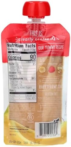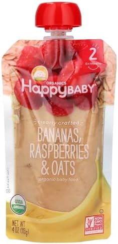 Happy Baby Organics Stage 2 Baby Food Pouches, Gluten Free, Vegan & Healthy Snack, Clearly Crafted Fruit & Veggie Puree, Bananas, Raspberries & Oats, 4 Ounces (Pack of 1)