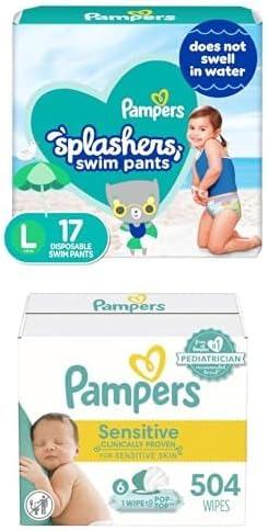 Splashers Swim Diapers - Size L, 17 Count, Gap-Free Disposable Baby Swim Pants + Pampers Sensitive Baby Wipes, Water Based, Hypoallergenic and Unscented, 6 Flip-Top Packs (504 Wipes Total)
