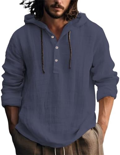 Linen Shirts for Men Lightweight Button Up Long Sleeve Shirts with Hood Regular Fit Cotton Beach Shirt