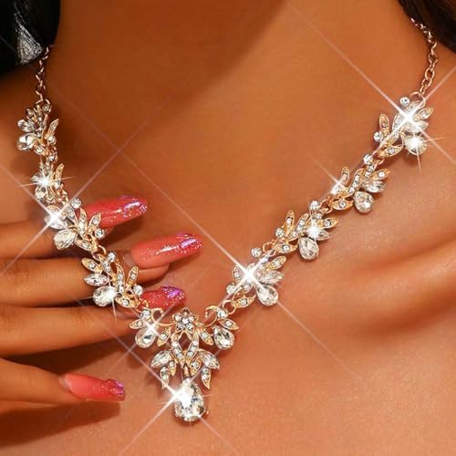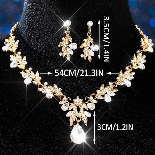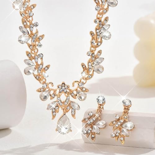 Unicra Rhinestone Bridal Wedding Jewelry Sets Gold Necklace Earrings Set Leaf Prom Formal Costume Jewelry Set for Women and Brides